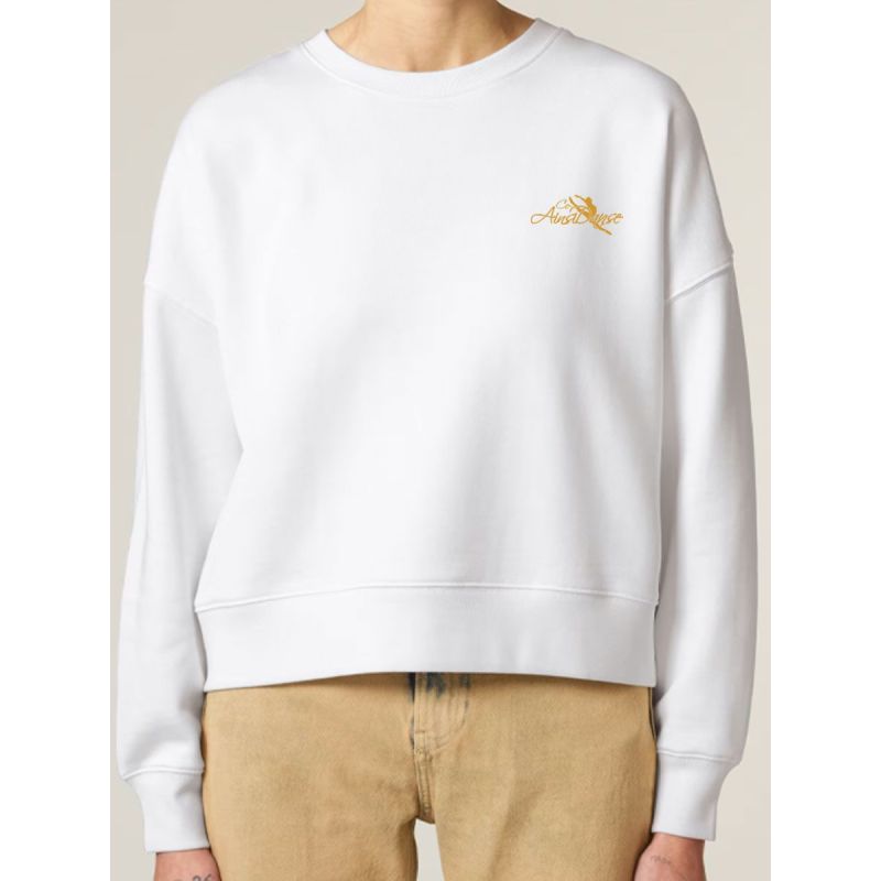 Manches montées Épaules tombantes Côtes 1x1 au col, aux poignets des manches et à l'ourlet du bas Surpiqûres doubles aiguilles sur toutes les coutures Bande de gros grain à l'intérieur du col au dos Demi-lune en tissu de la même matière au dos du cou